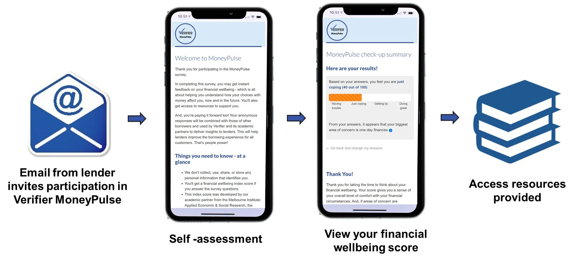 Your MoneyPulse journey begins with an email invitation from your lender, which will give you a link to Verifier and the MoneyPulse survey. When you are ready, click on the survey link in the email.